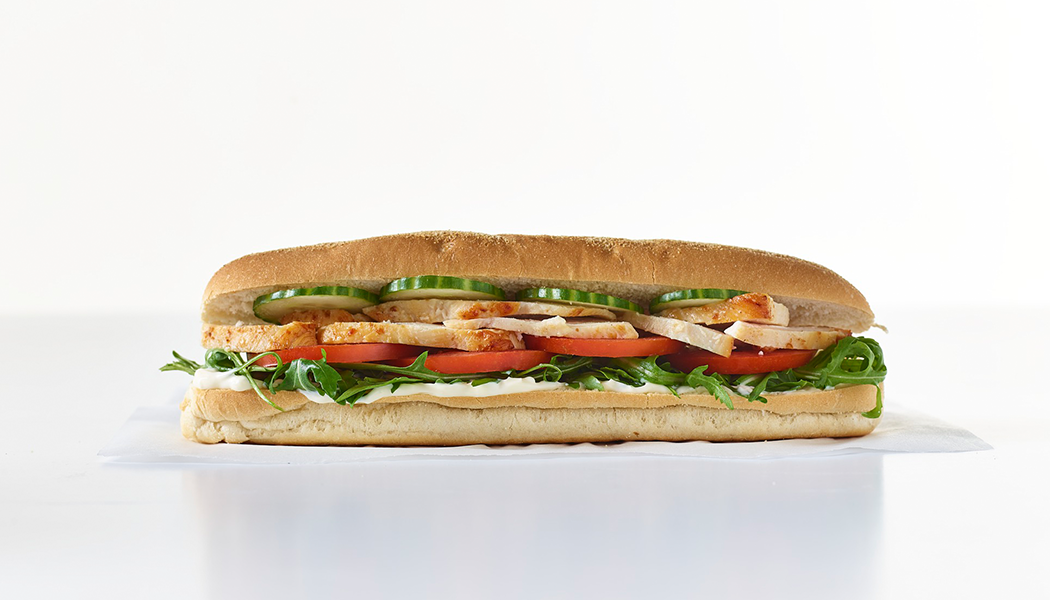 Roast chicken, rocket, tomato, cucumber & mayo on a malted torpedo roll